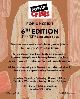 This year’s Pop-Up Crisis is now open on the first floor of 18-19 Savile Row. Look out for a wealth of big-label designer clothing and accessories, high-end homeware and some interesting pieces from Savile Row Bespoke Association members, including Dege & Skinner, Hackett, Huntsman, Richard Anderson and Richard James. With all proceeds going to Crisis, the national homelessness charity, it’s …